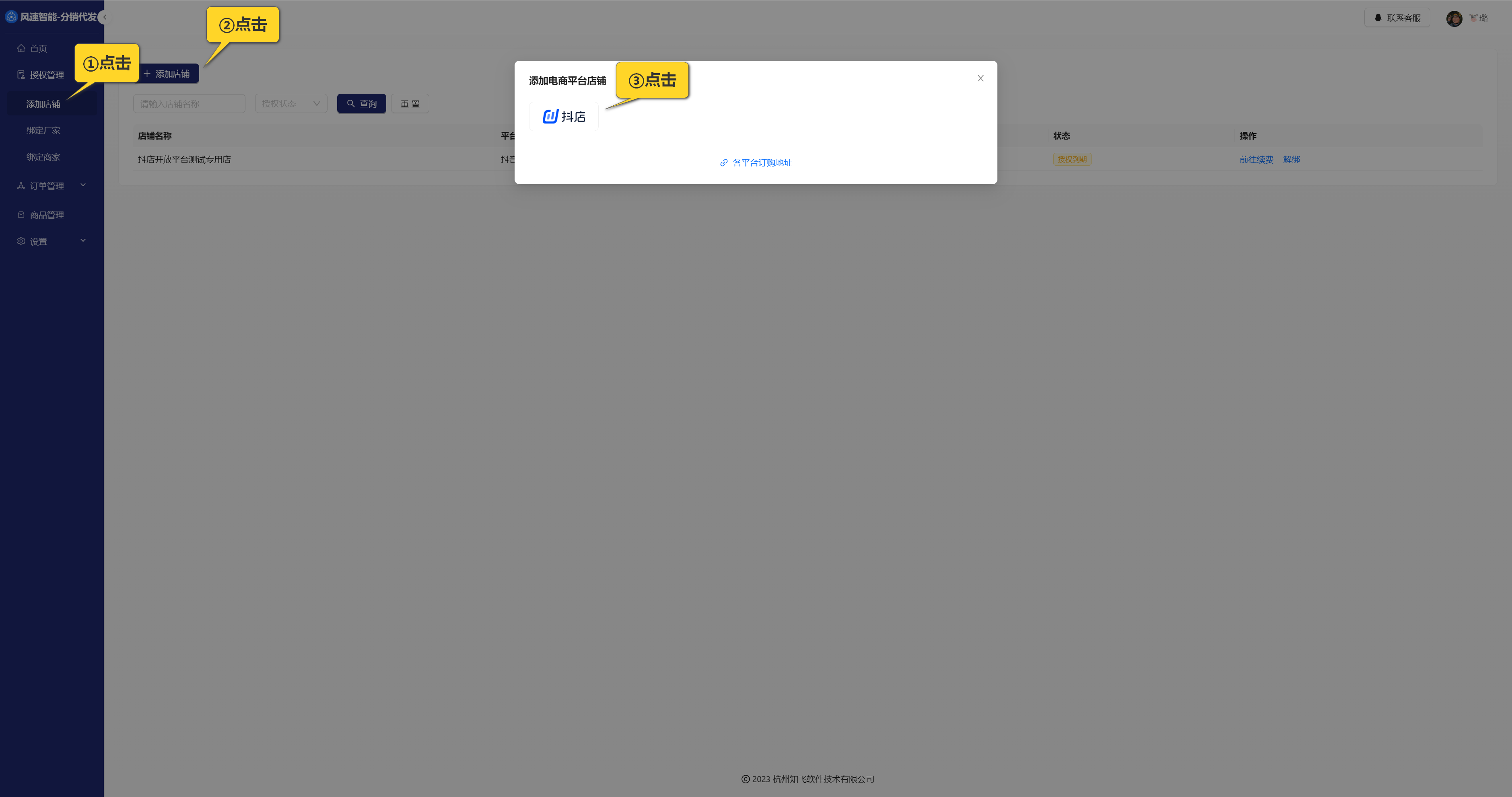 登录风速分销代发,【授权管理】-【添加店铺】,选择对应平台进行授权。
