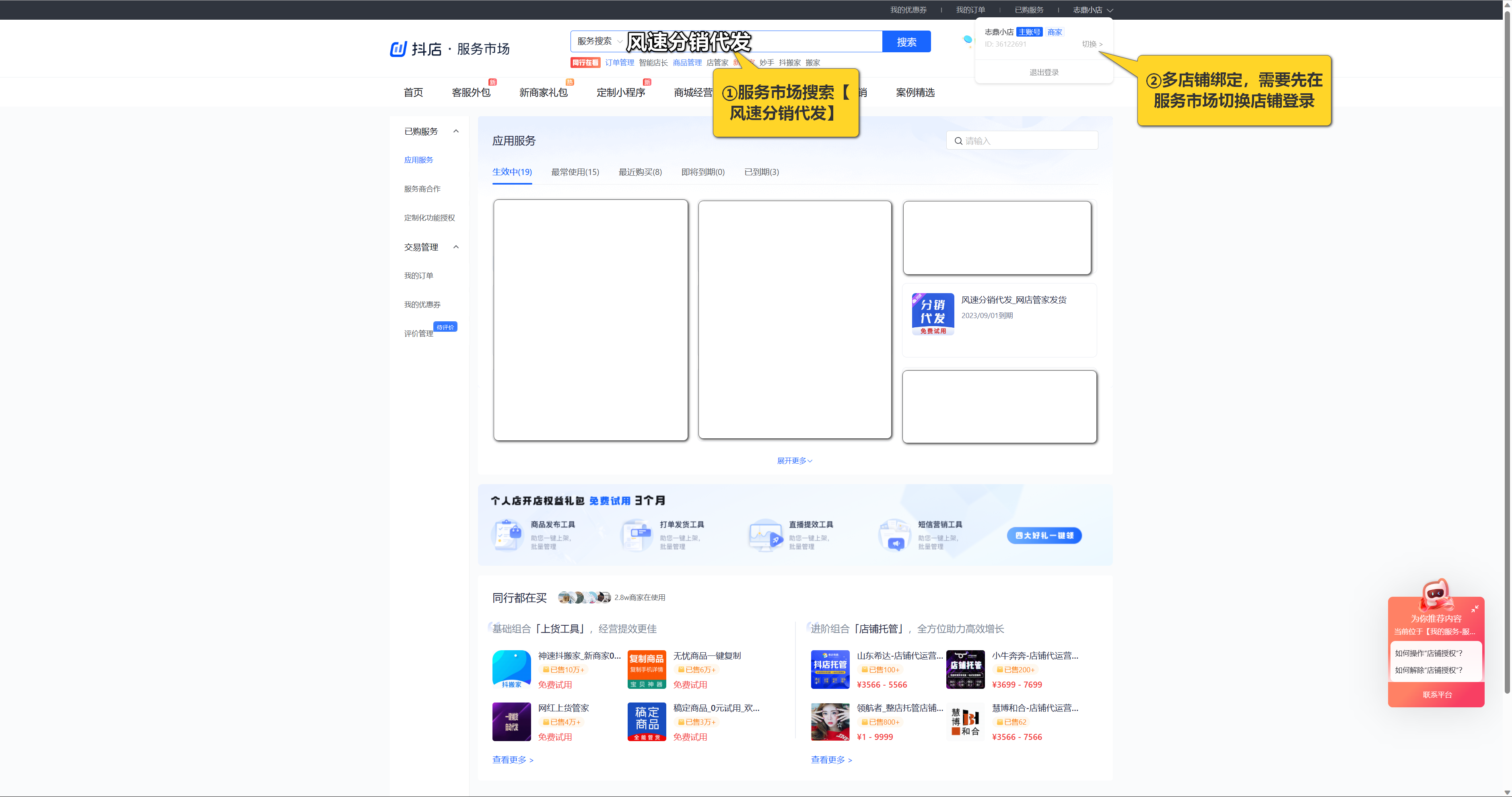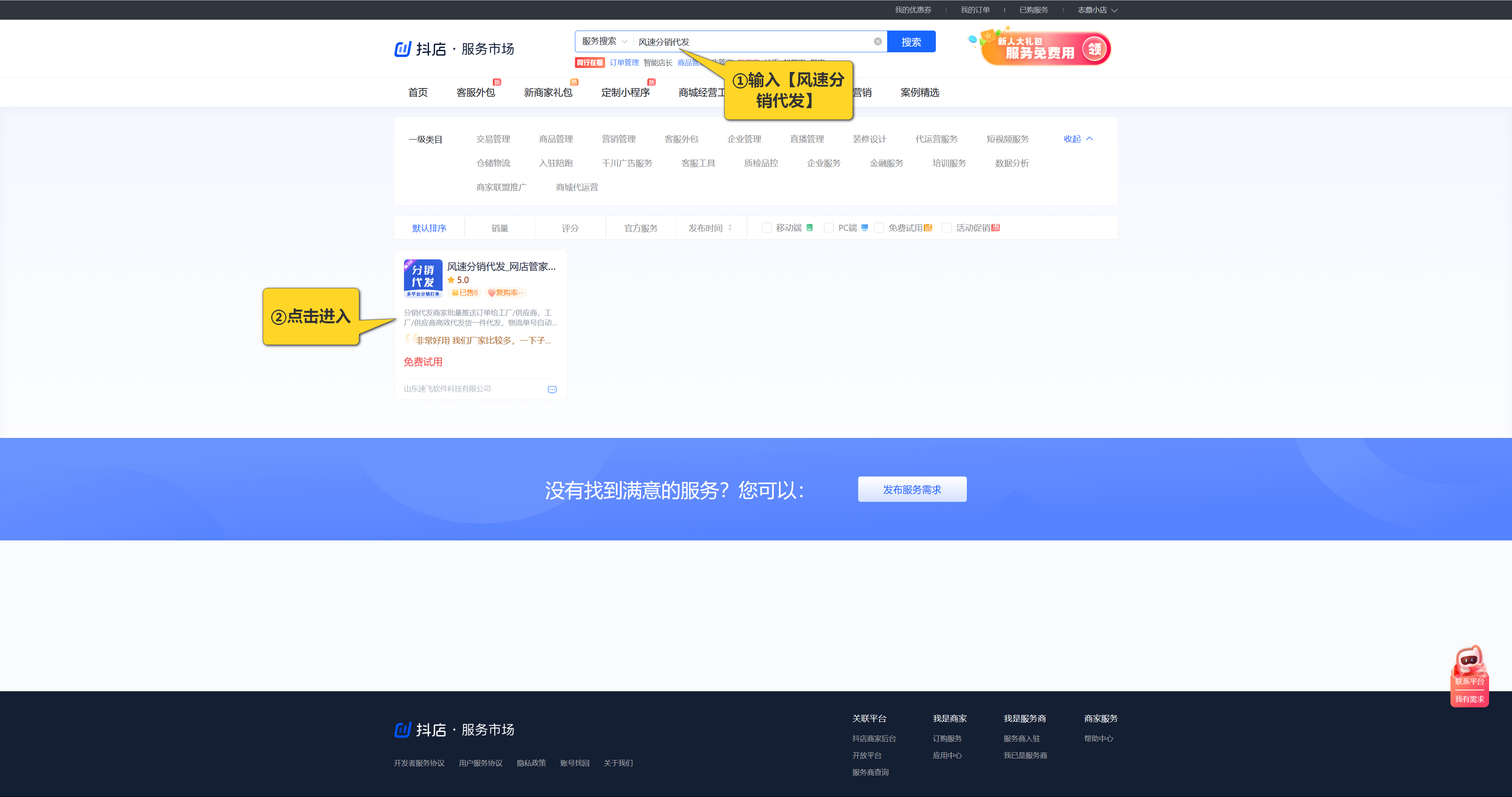 2.通过服务市场,搜索‘风速分销代发’,点击进入。