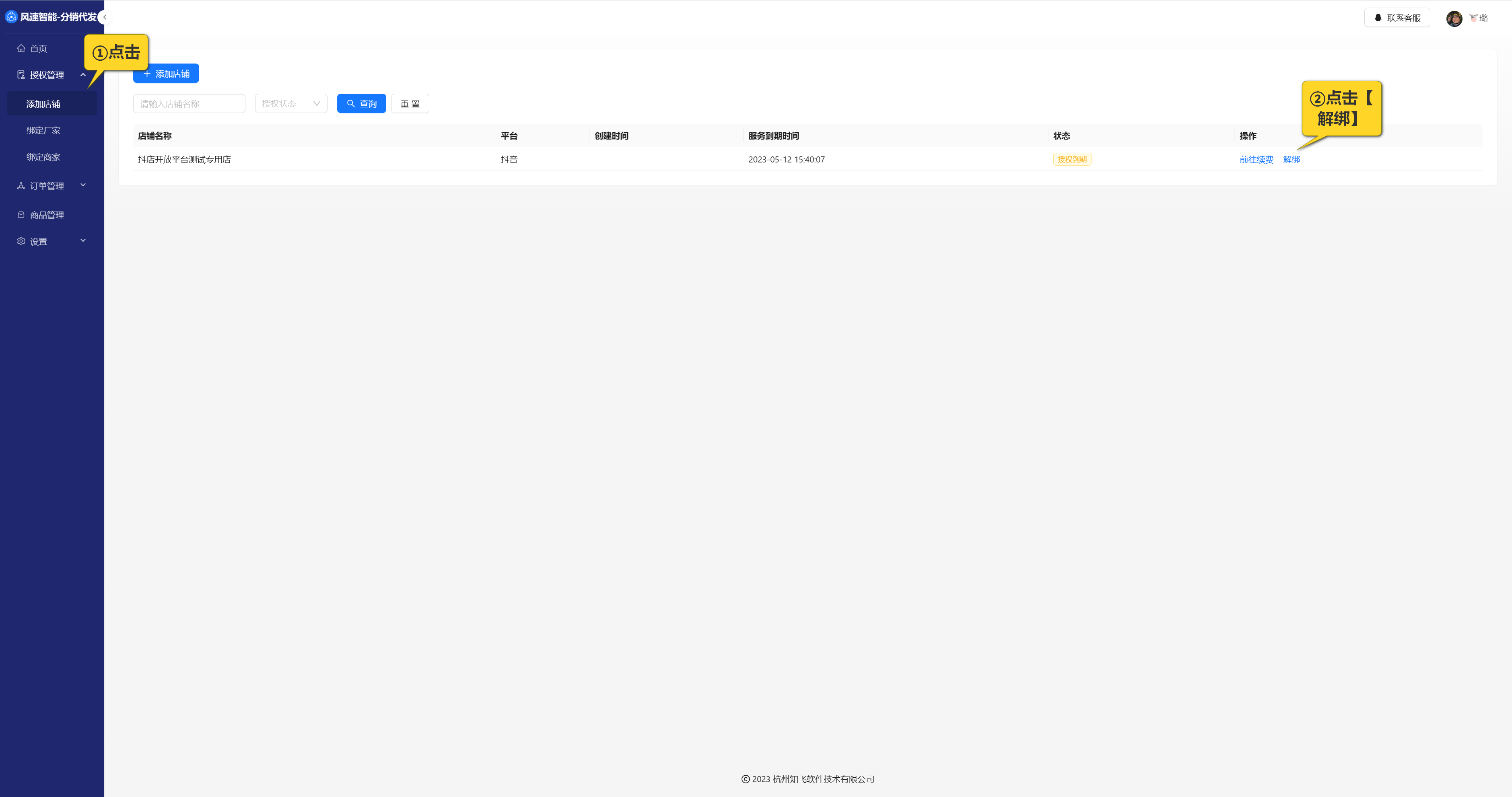 操作步骤注意:店铺一旦解绑,将无法下载该店铺的订单、商品,无法使用该店铺授权获取运单号、发货,历史订单数据无法恢复,请谨慎操作!登录风速分销代发,【授权管理】-【添加店铺】,找到要解绑的店铺,在操作列点击【解绑】。