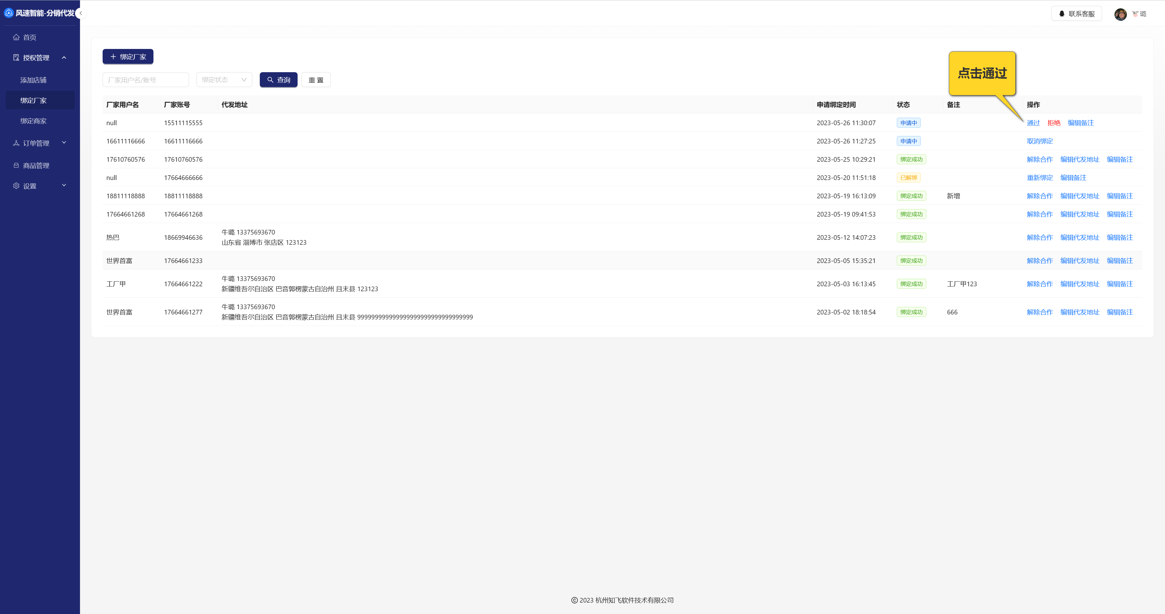 3. 点击【待确认合作】后,点击【通过】,就绑定了