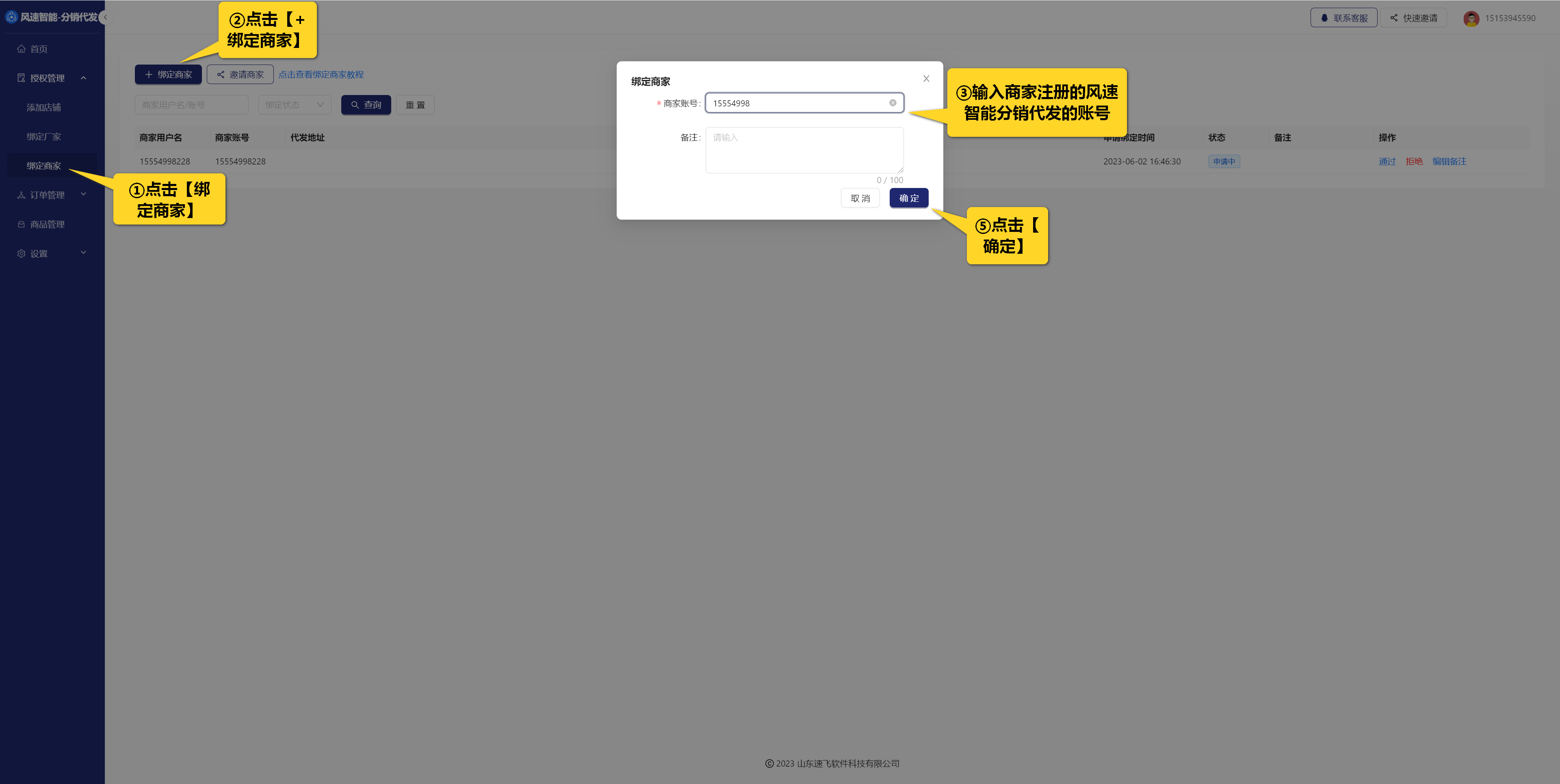 方式一:1.【授权管理-绑定商家】点击【绑定商家】,输入商家风速分销代发账号,发送绑定邀请,