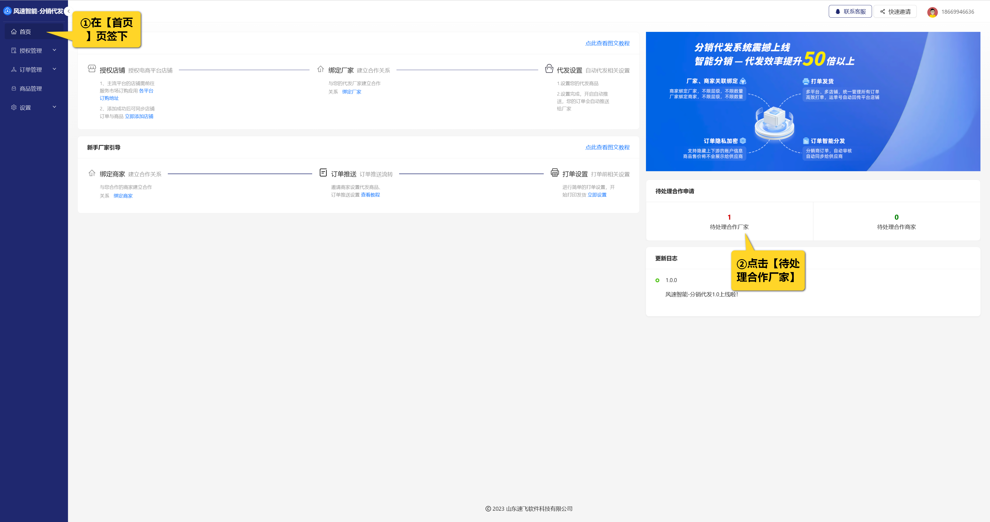 2.被邀请的商家,需要登录风速分销代发,进入系统后点击【待确认合作】