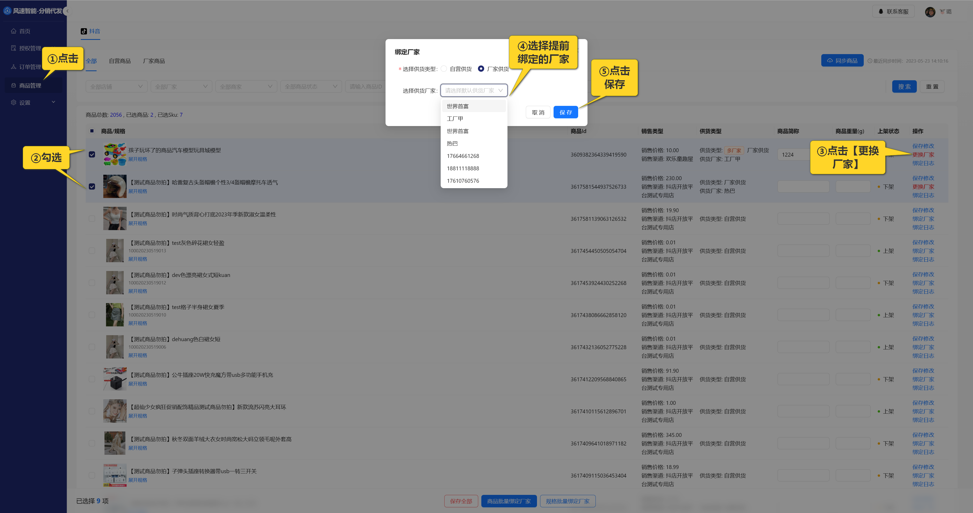- 【商品管理-商品列表】,勾选商品或者商品下的不同规格商品,进行【绑定厂家】。