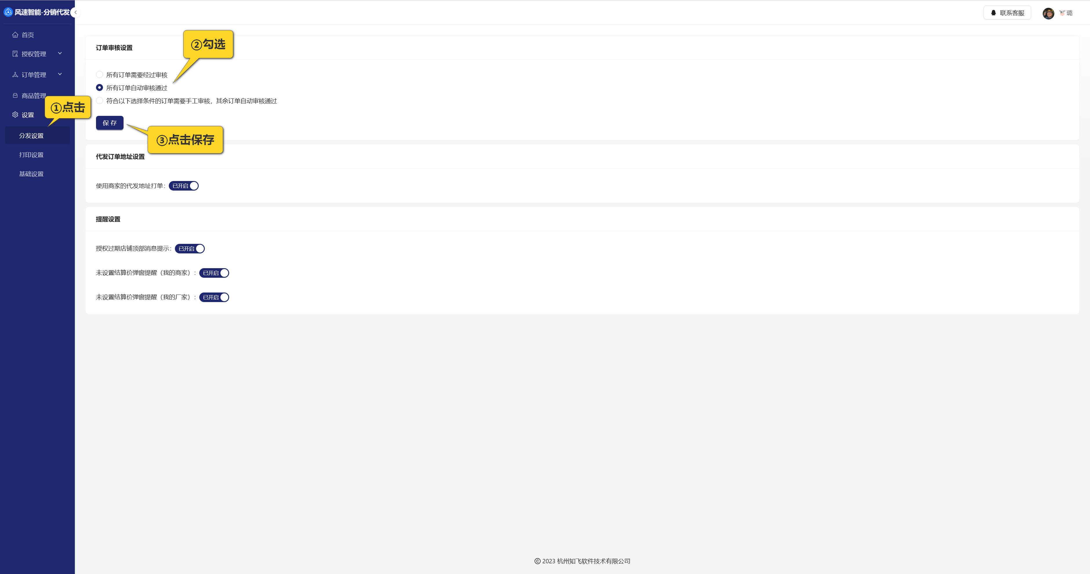 - 当您的商品全部已经绑好厂家,可以开启【所有订单自动审核通过】,实现自动分发订单给厂家!