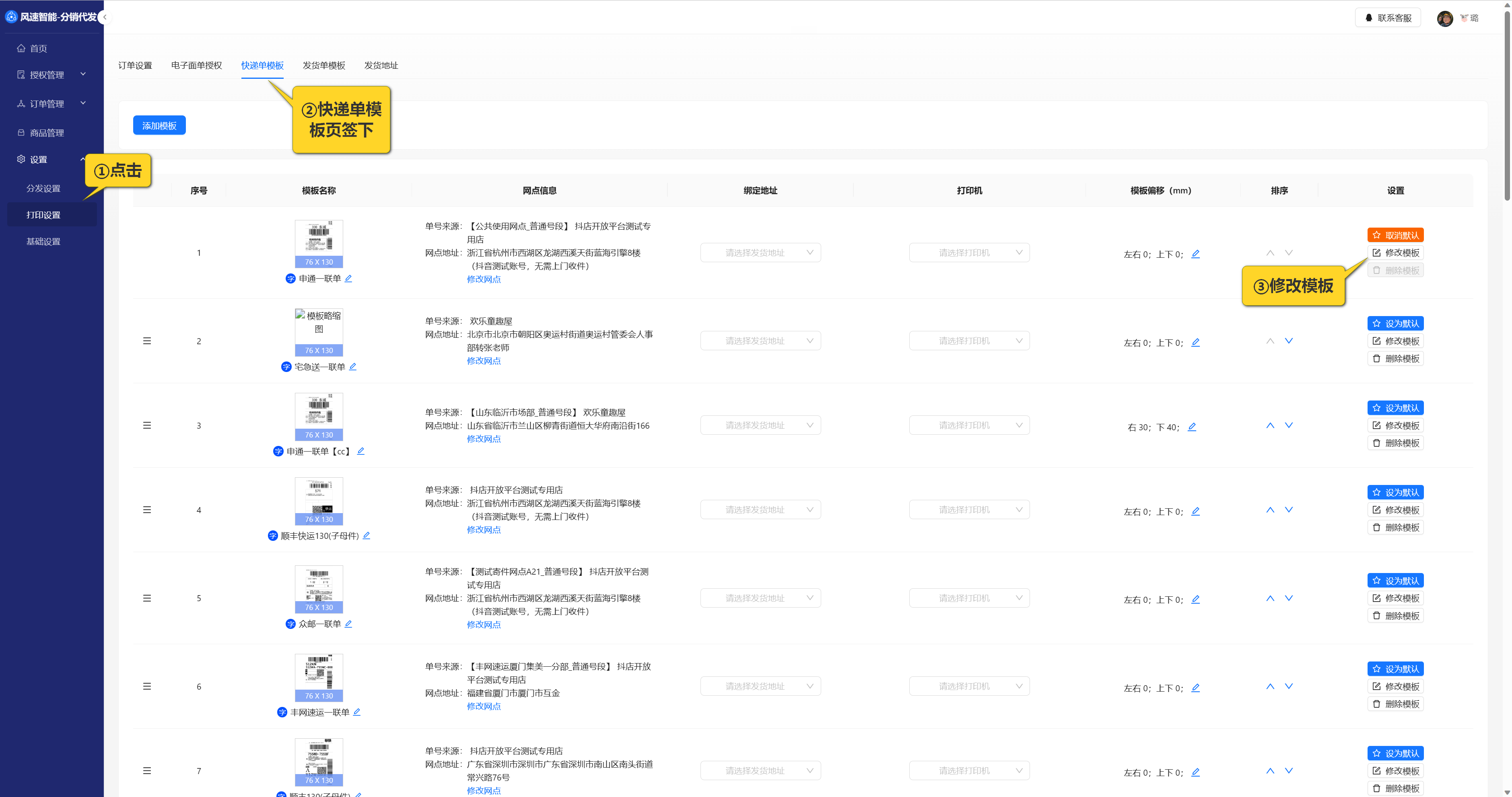 【设置-打印设置-快递模板】,选择要修改的快递模板,点击【修改模板 】