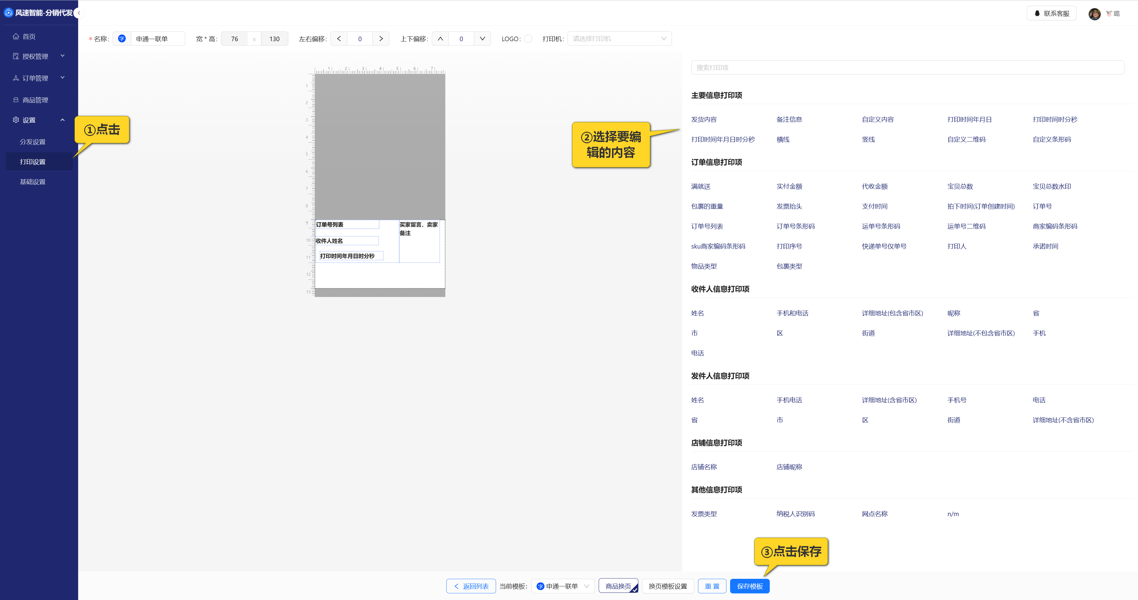 编辑勾选打印项,点击【保存模板】即可