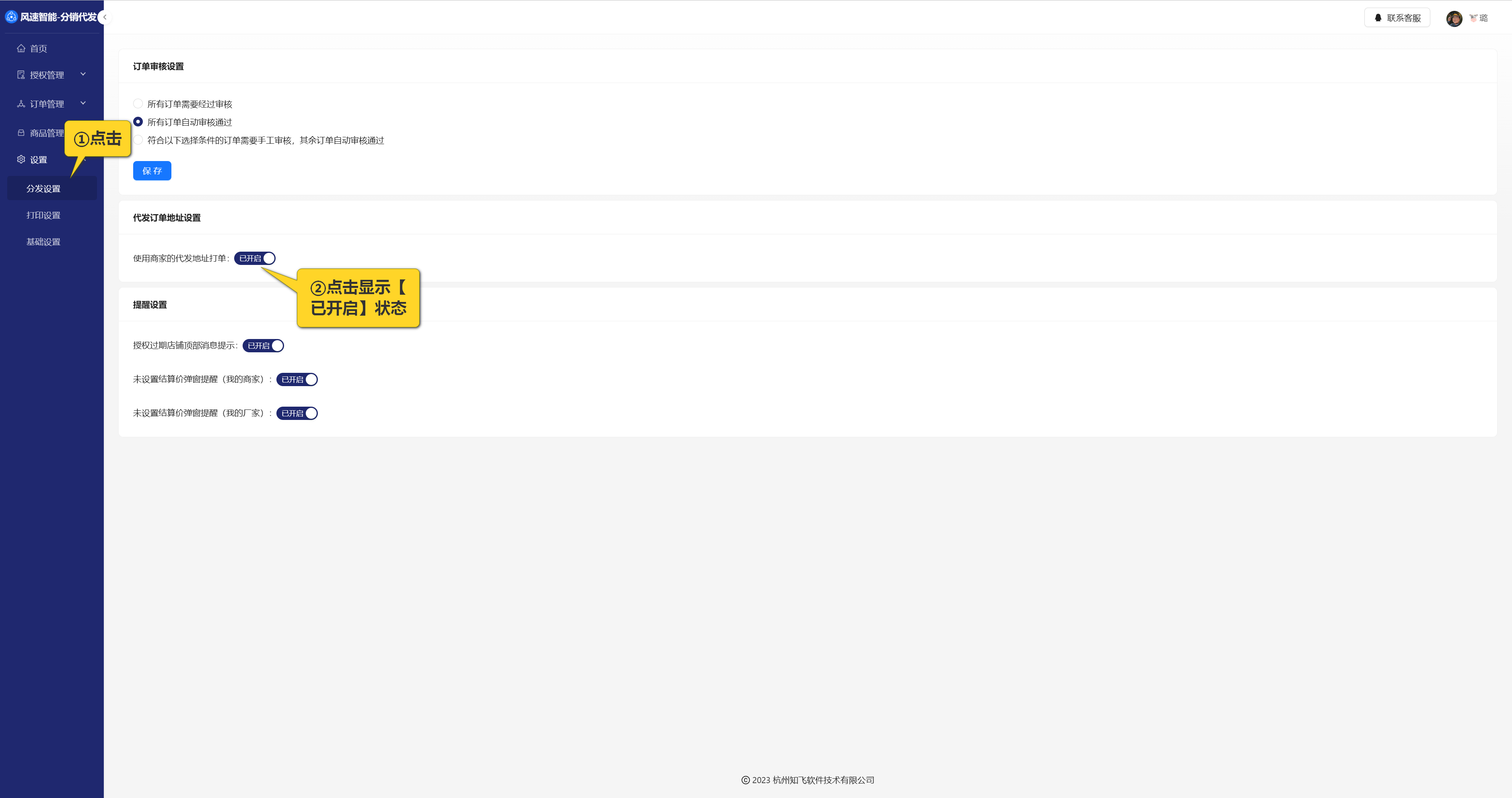 【分发设置】——【代发订单地址设置】,点击显示”已开启“状态