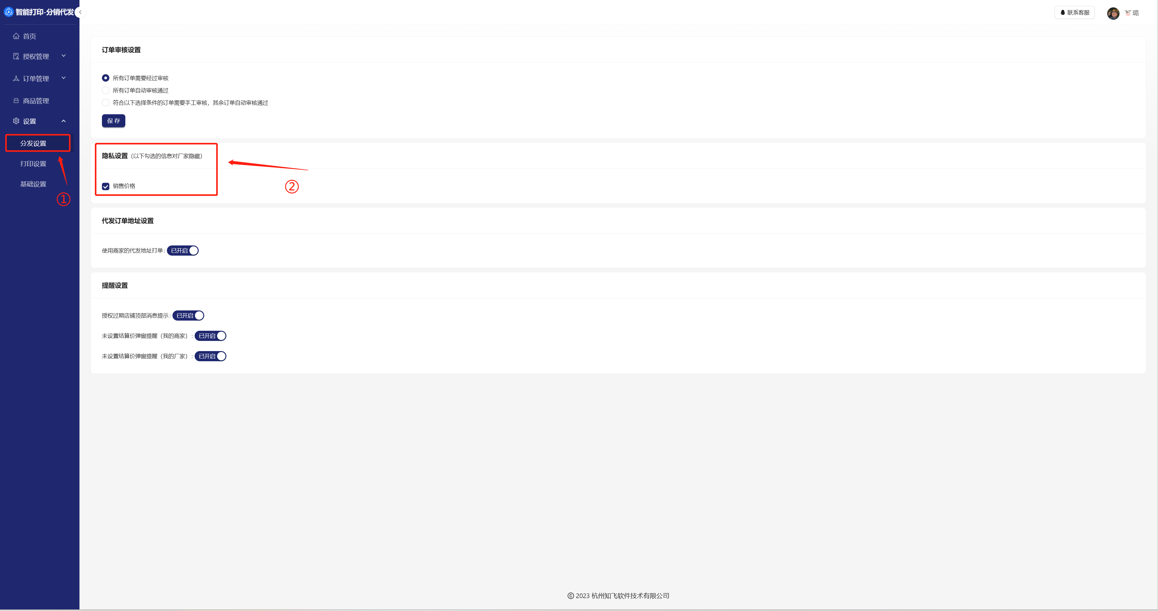 【分发设置】——【隐私设置】,勾选“销售价格”,上游厂家就看不到自己店铺的产品销售价格了