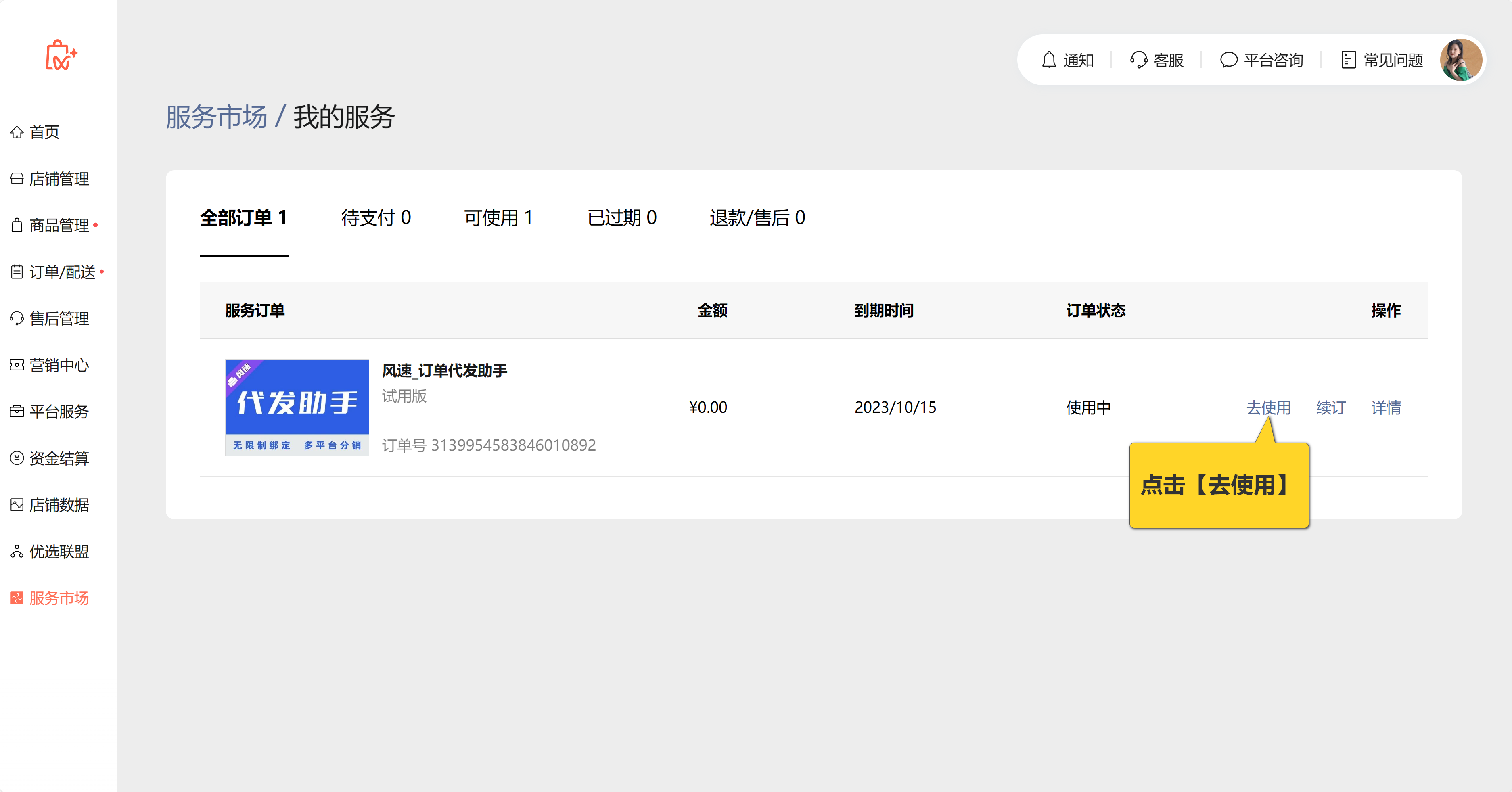 注意一定要确认店铺名称再订购风速-订单代发助手