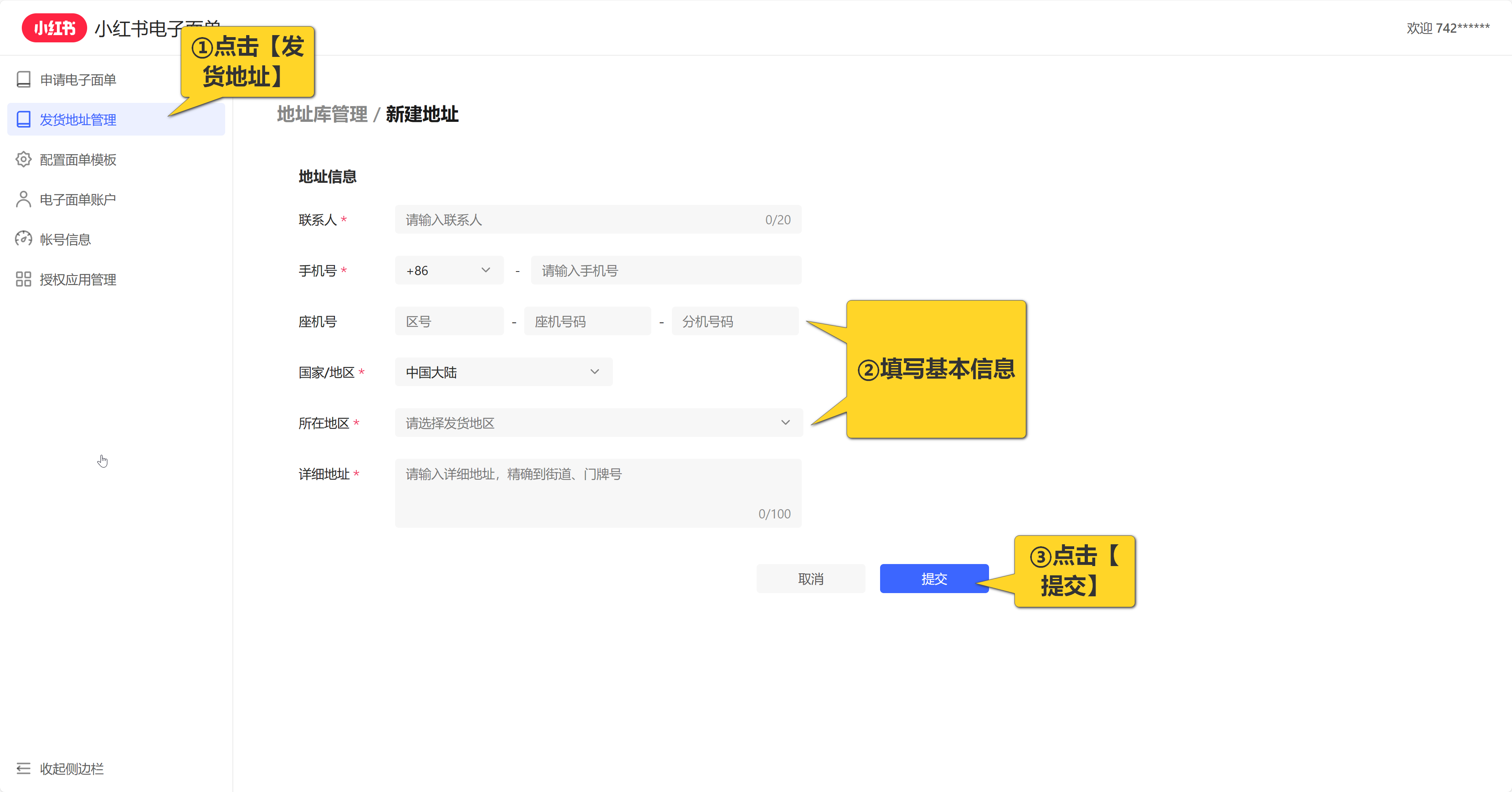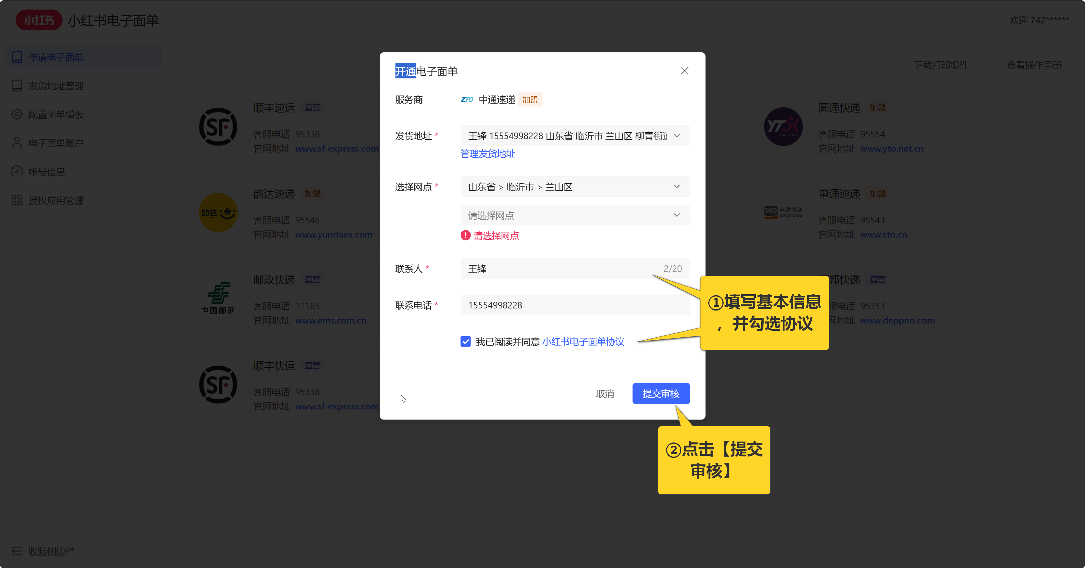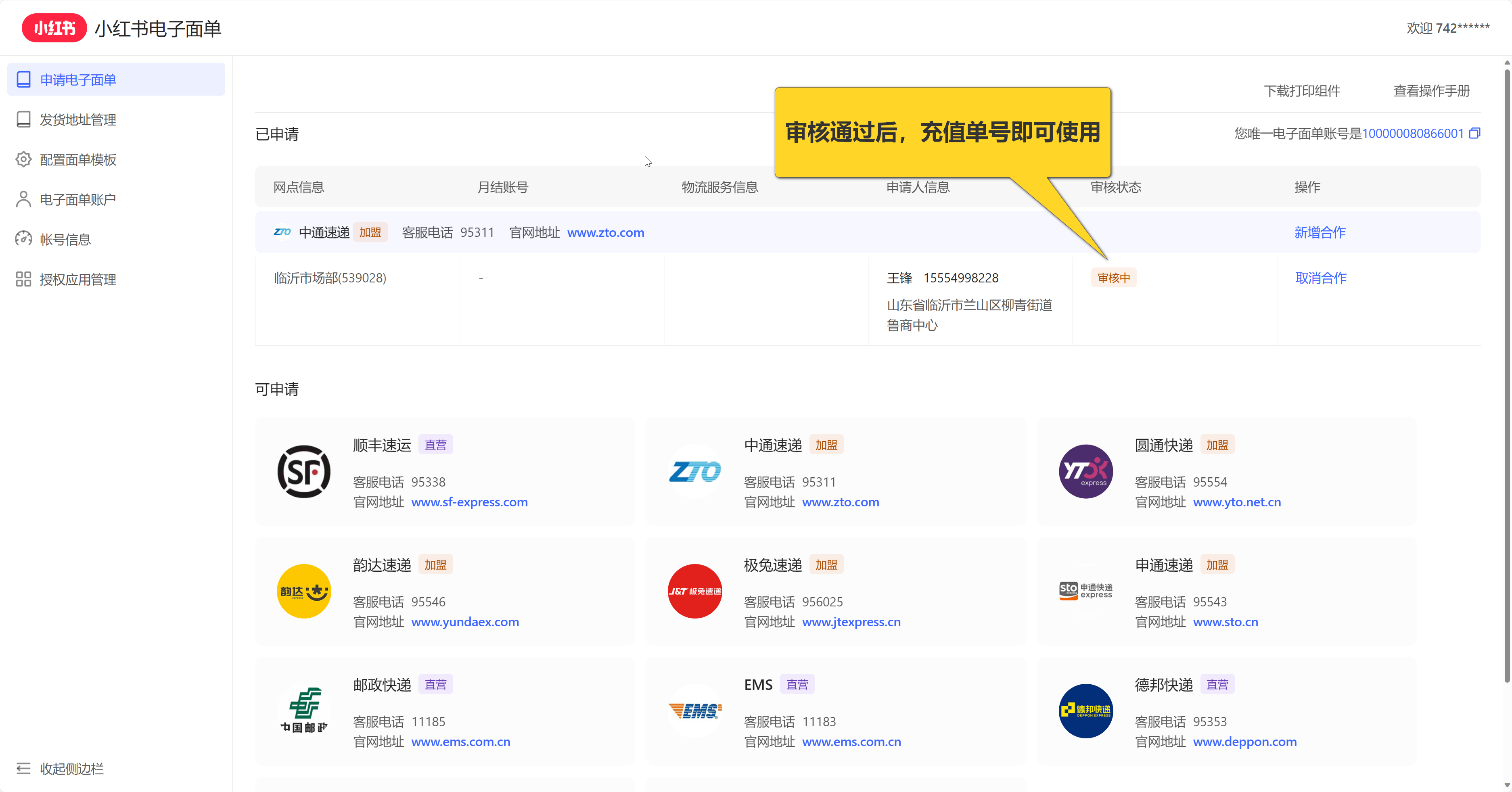 登录成功后,按照如下步骤开通小红书电子面单