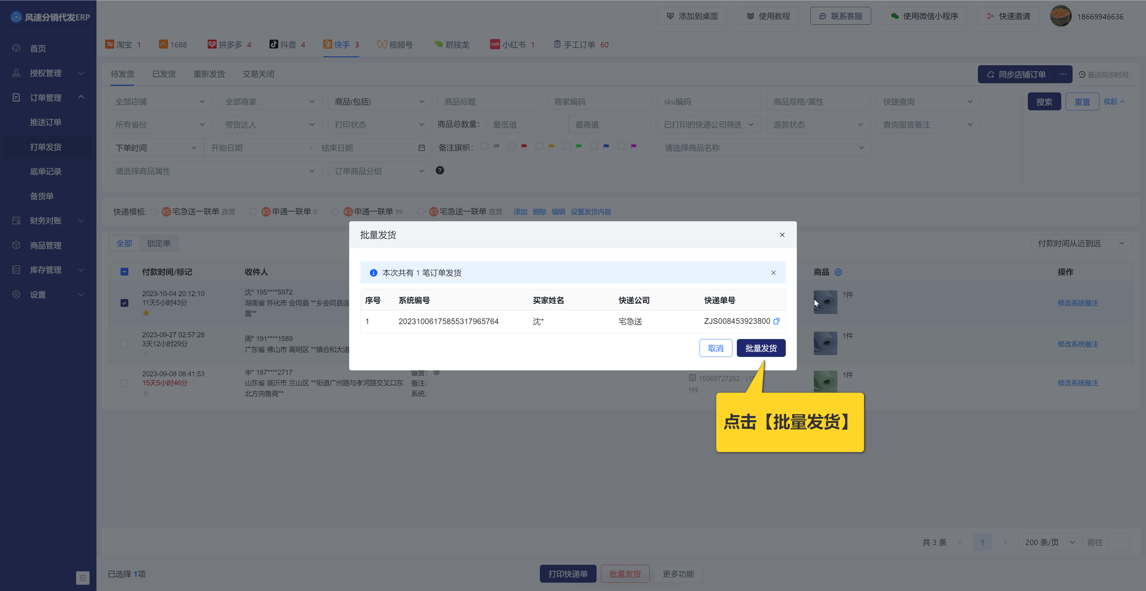 2、打印后,一定要点击【批量发货】,这样快递单号就自动上传到小红书小店后台了