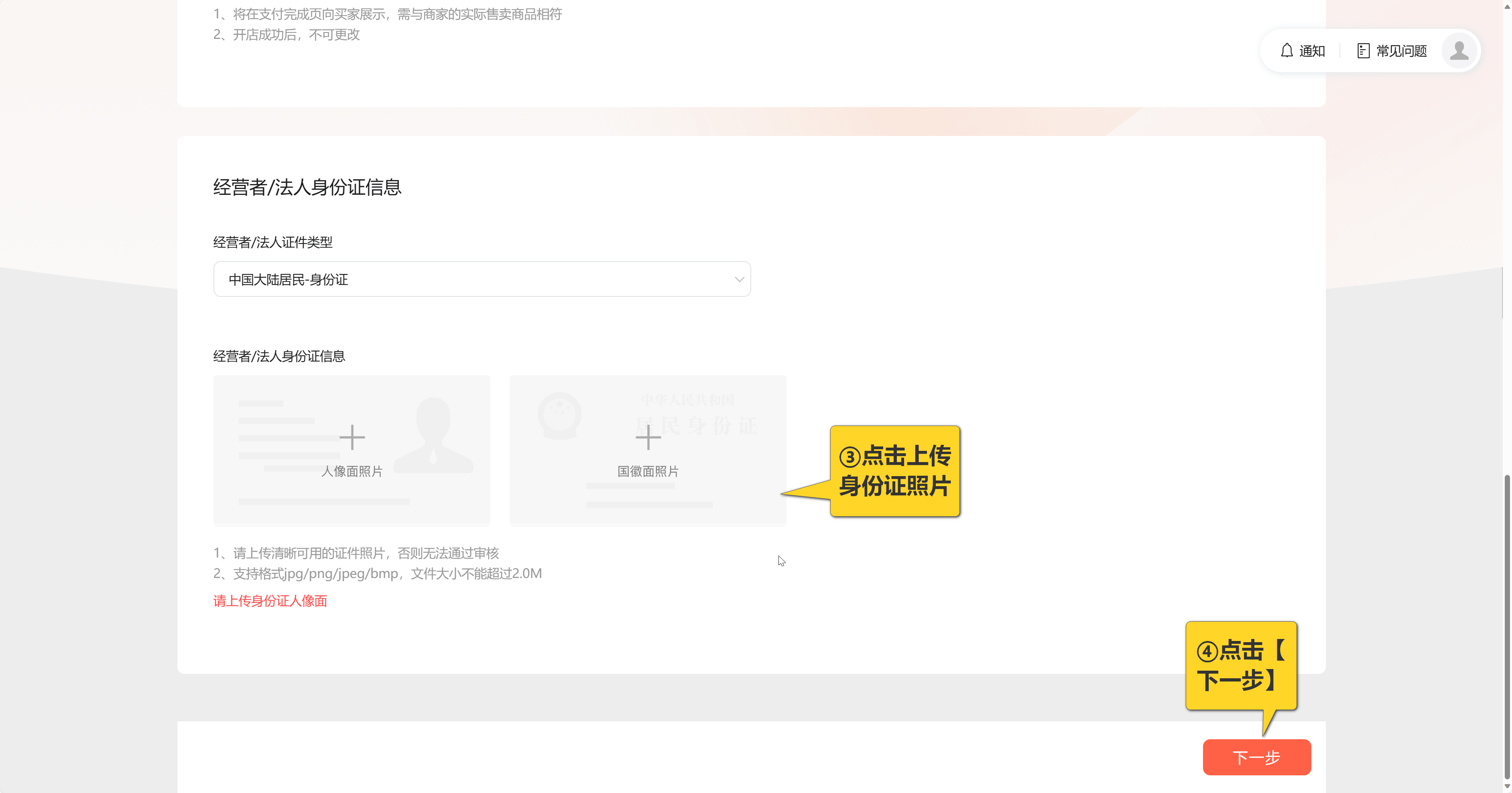 · 上传经营者或法定代表人身份证正反面