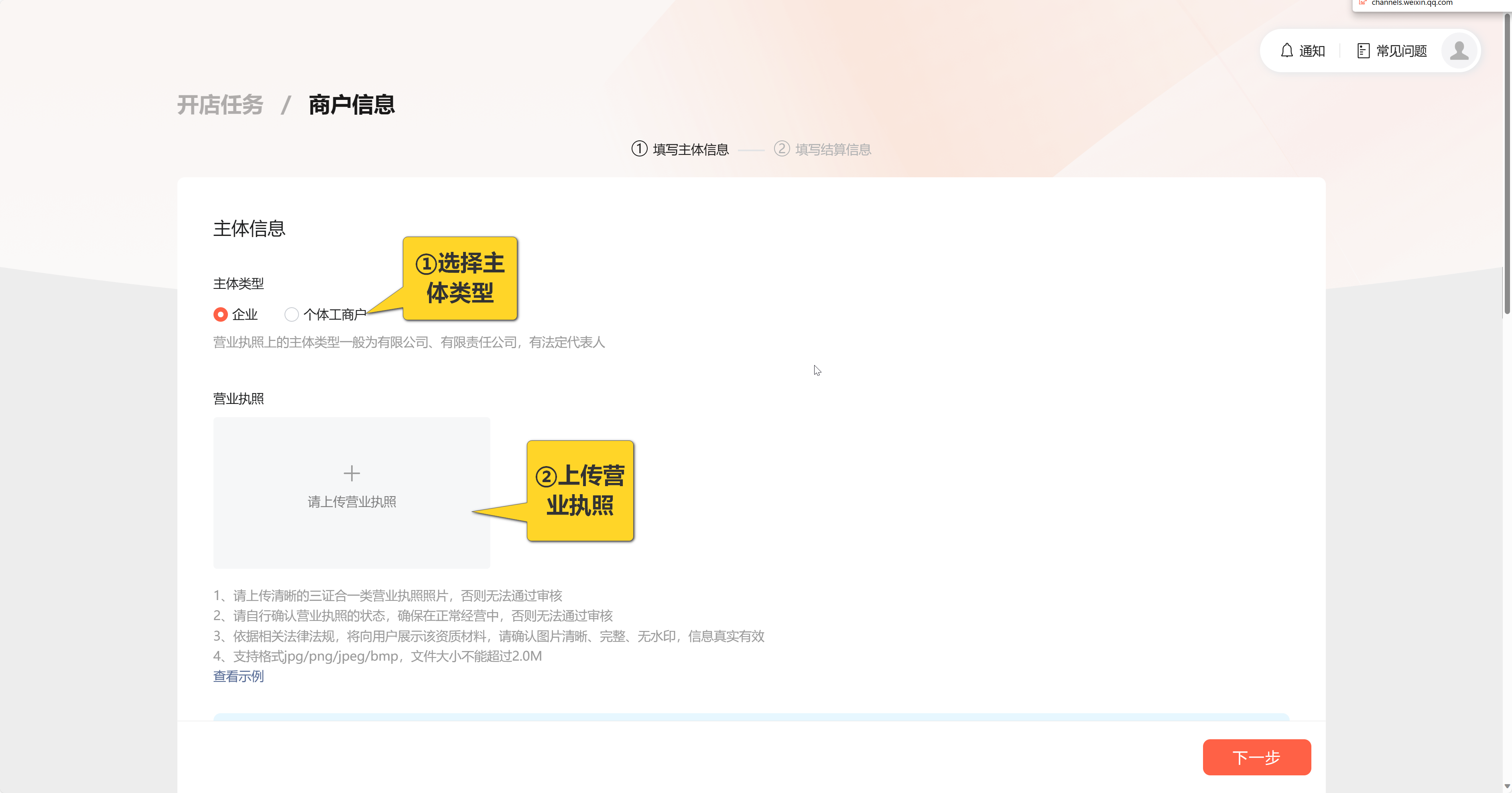 · 「主体类型」选择个体工商户或企业入驻的方式。并上传