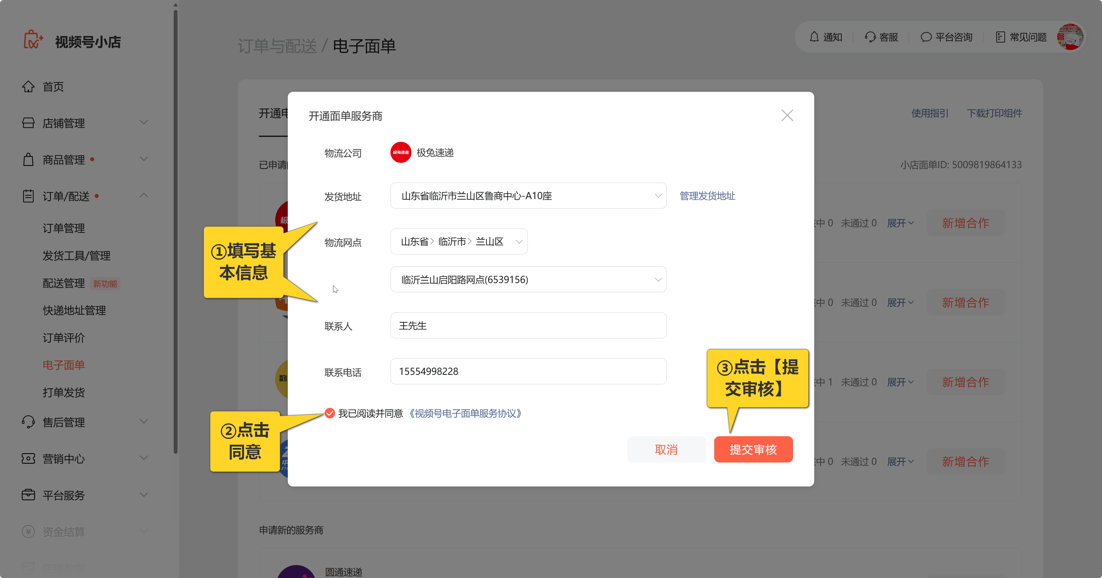 · 后台显示「开张成功」,即可进入微信小店开通电子面单啦