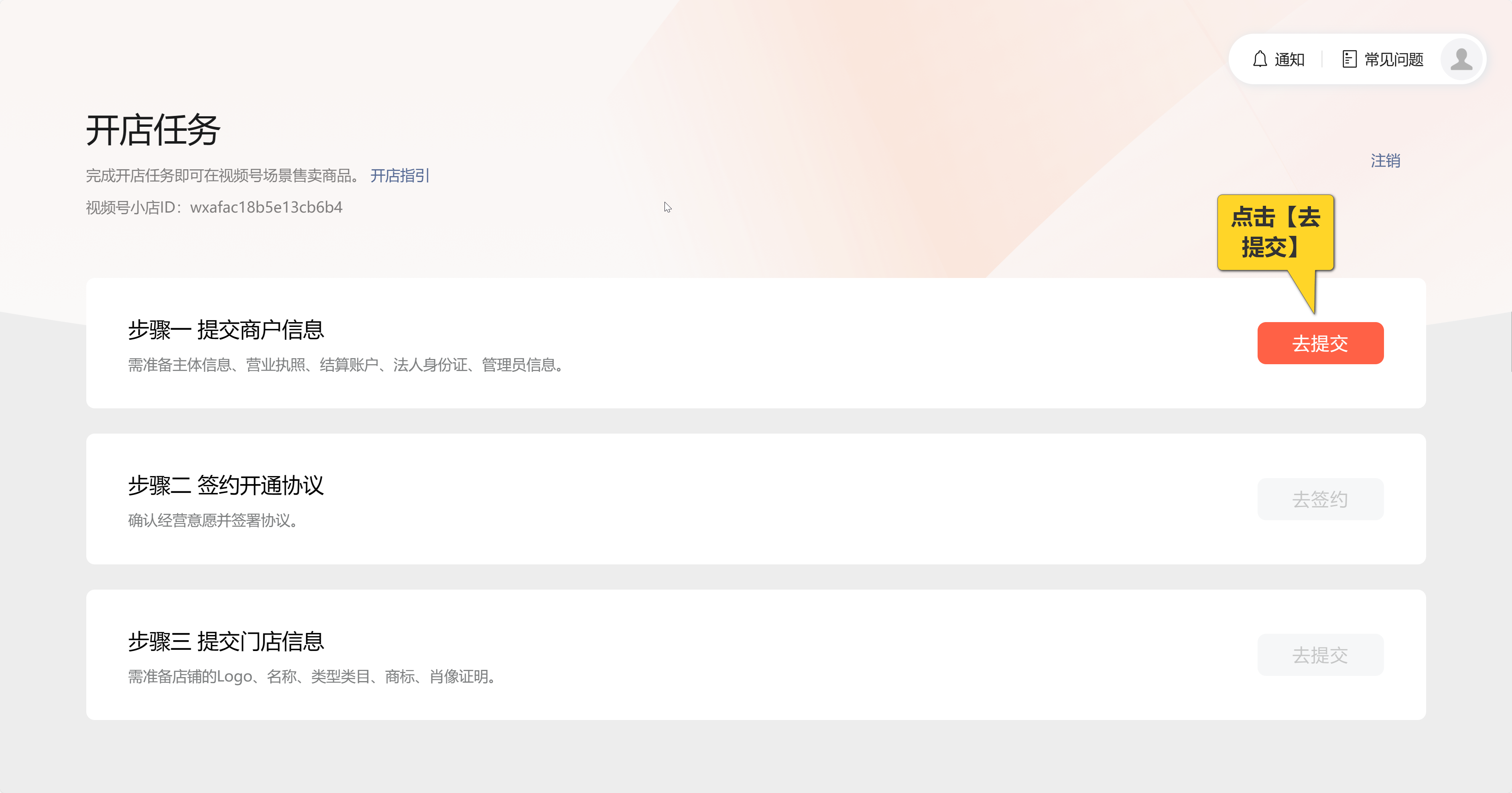 · 扫码登录后,需要完成开店任务,开启微信小店。