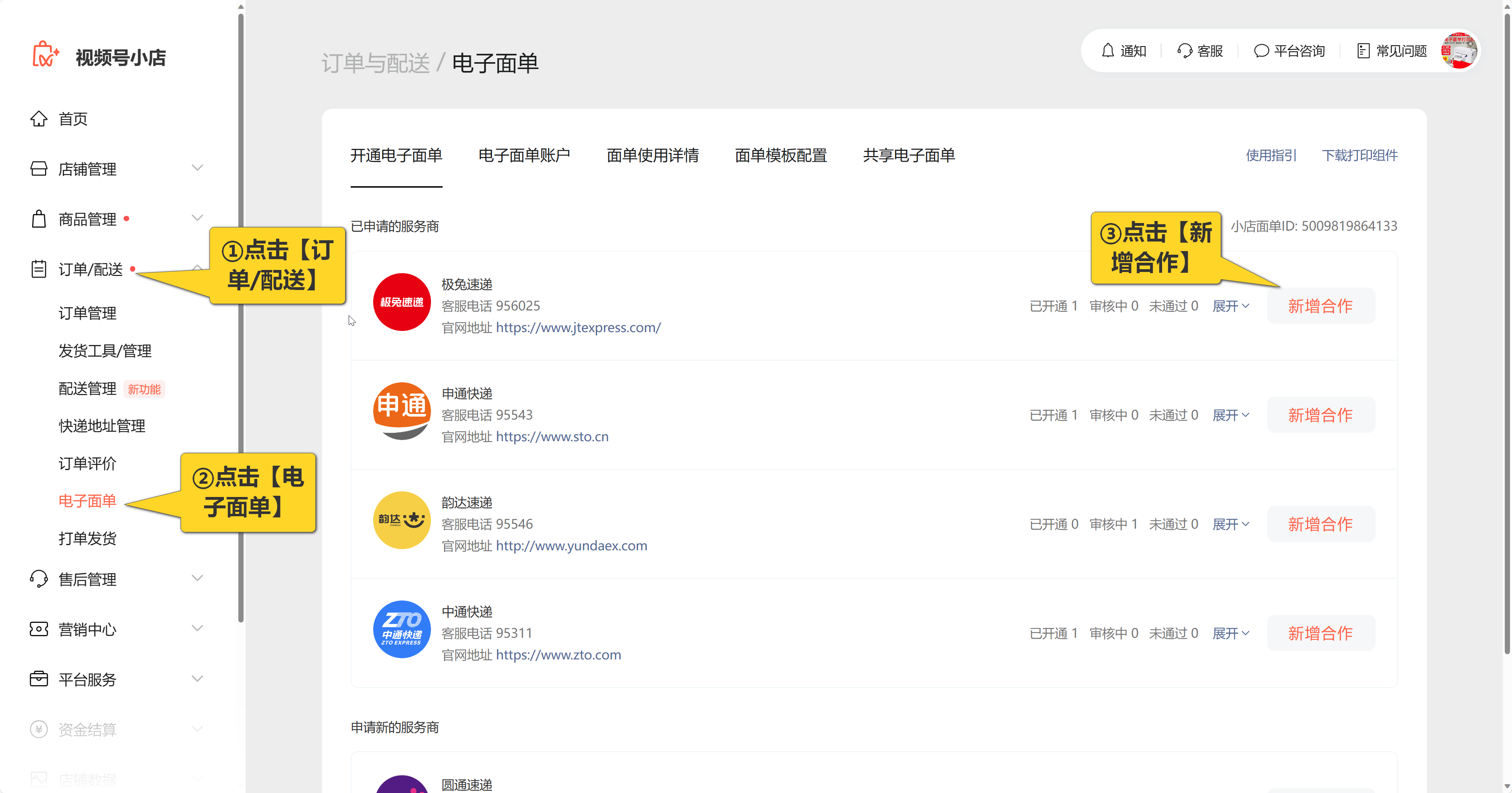 1.进入微信小店后台界面 - 左边菜单栏【订单/配送】 - 点击【电子面单】进行开通电子面单。选择要开通的快递,并点击【新增合作】